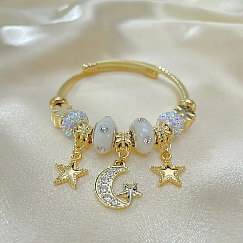 Elegant 18K golden-plated Sun, Moon & Stars pendant bracelet featuring sparkling synthetic zirconia. Perfect for everyday wear, parties, Christmas, Valentine's Day, and makes a stunning charm gift for loved ones.